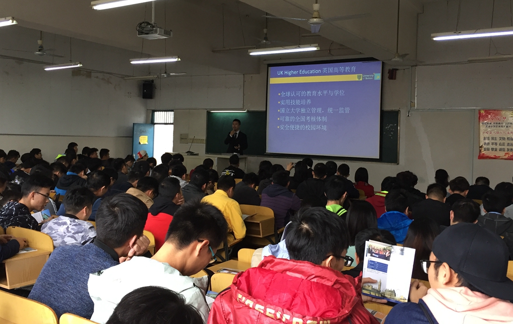 当天下午,Ben Chen等一行和在校三届180余位中英班学生共同分享了在博尔顿大学学习和生活情况、升学途径、申请注意事项,解答了2018年大三学生赴英继续双学位学习材料办理相关问题。正在学校为中英班授课的博尔顿大学材料研究所博士生导师耿俊峰教授也为学生做了学业方面的指导。