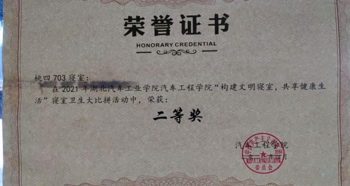 组织的寝室卫生大比拼活动中荣获二等奖,形成了互帮互相、文明和谐的良好宿舍氛围。