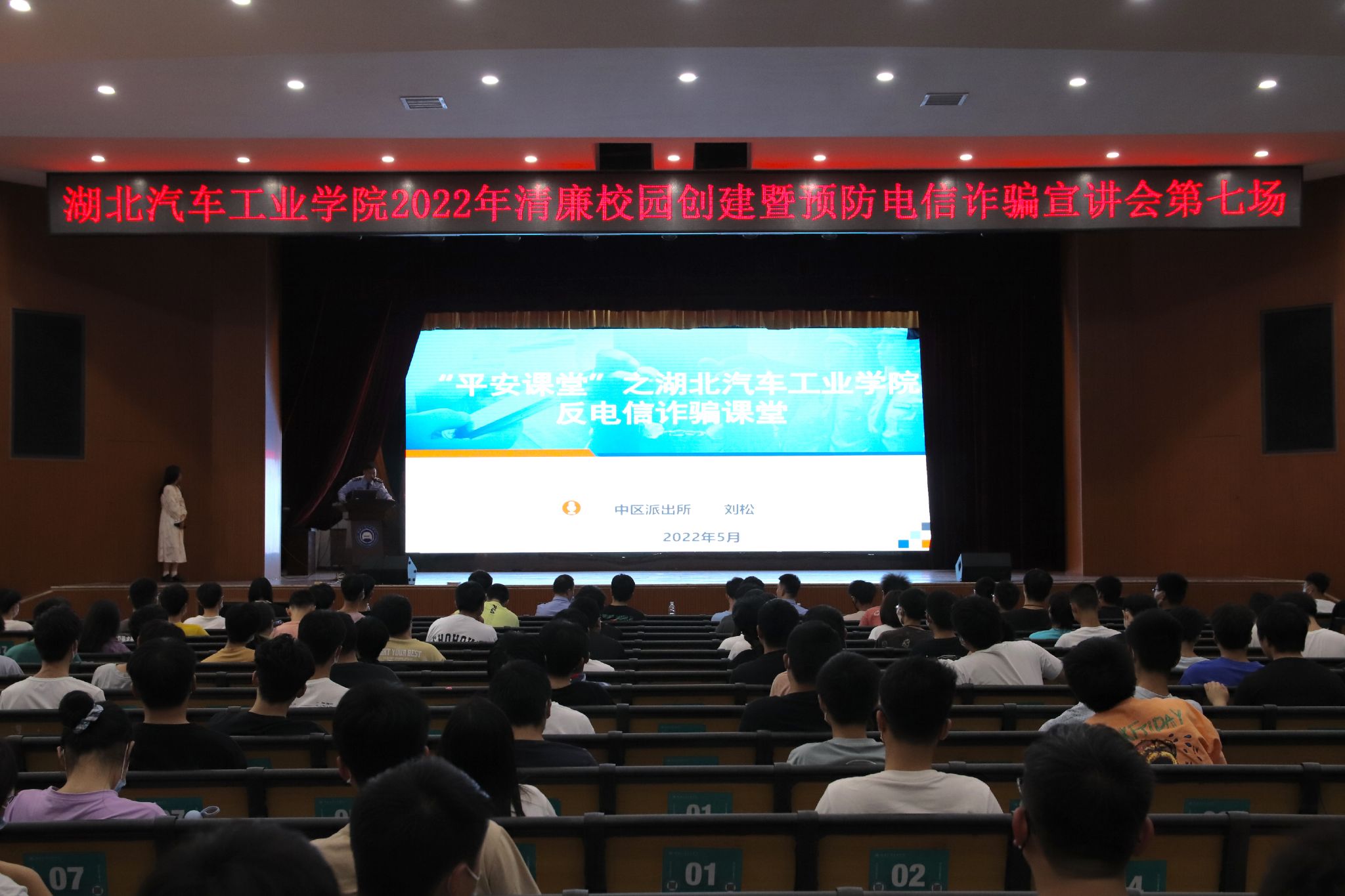 分党委书记李秀峰、副书记杜昕俊、学工办辅导员及大一、大二年级学生参加了宣讲会,市公安局东岳分局防电诈宣讲团、校保卫处在会上对防范电信诈骗进行了部署强调。