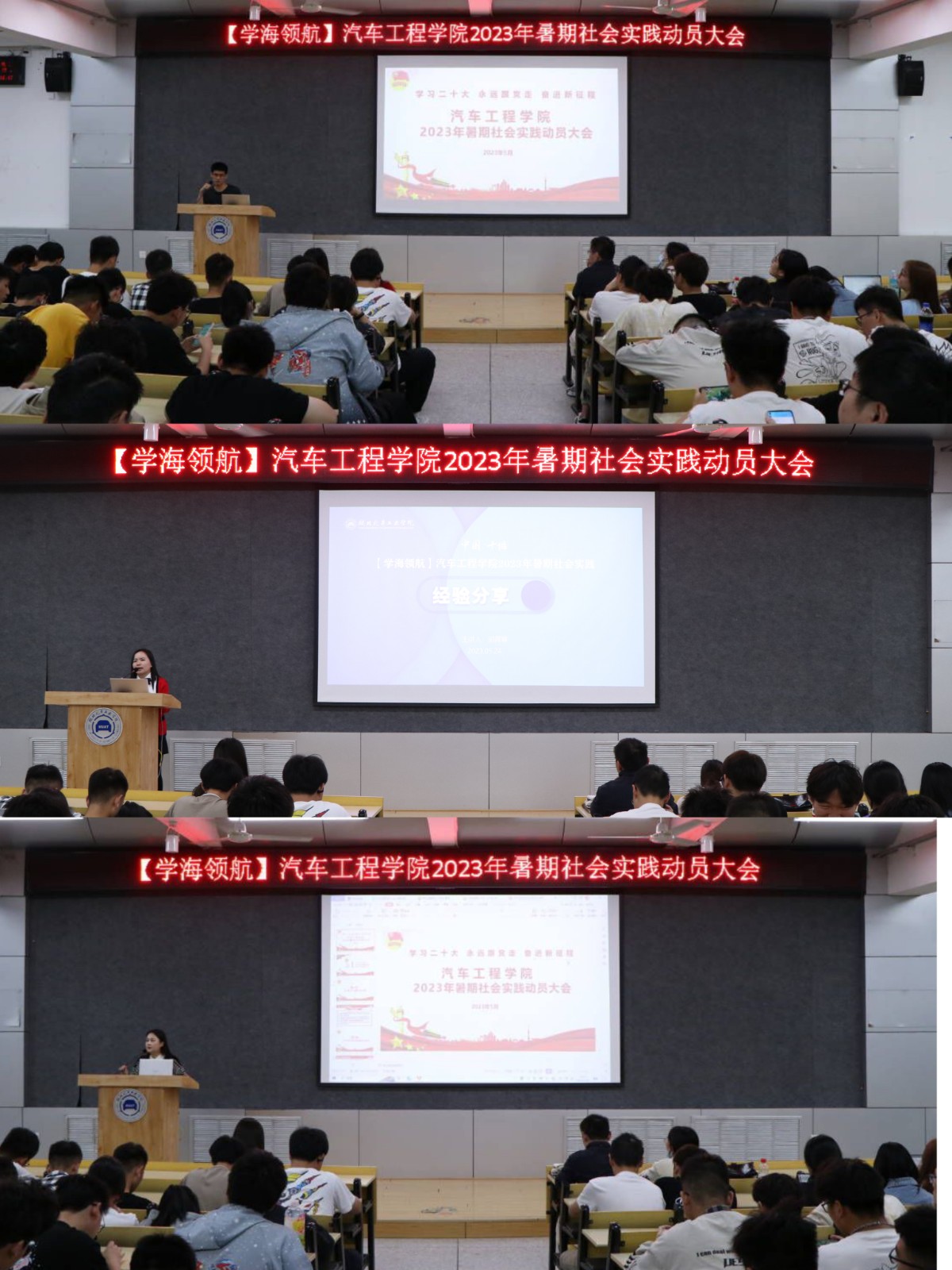 于6113教室开展2023年暑期社会实践动员大会。学工办主任胡霄寒、分团委书记李雅琨、辅导员李旭、甘甜及22级全体学生参加了此次活动。