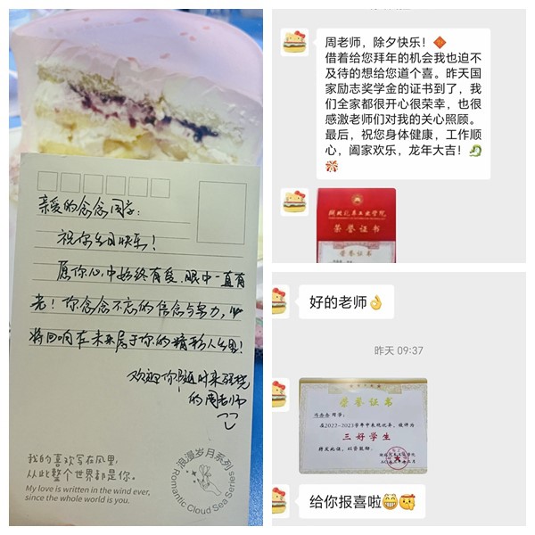 寄来的国家励志奖学金和评为校级“三好学生”后,冯念念第一个给老师报喜。近日,在谈话过程中得知3月6日是她的生日后,周彬当即决定为她和结对宿舍过一个集体生日,亲手为冯念念带上了生日帽,送上了生日蛋糕和亲手写的生日祝福。