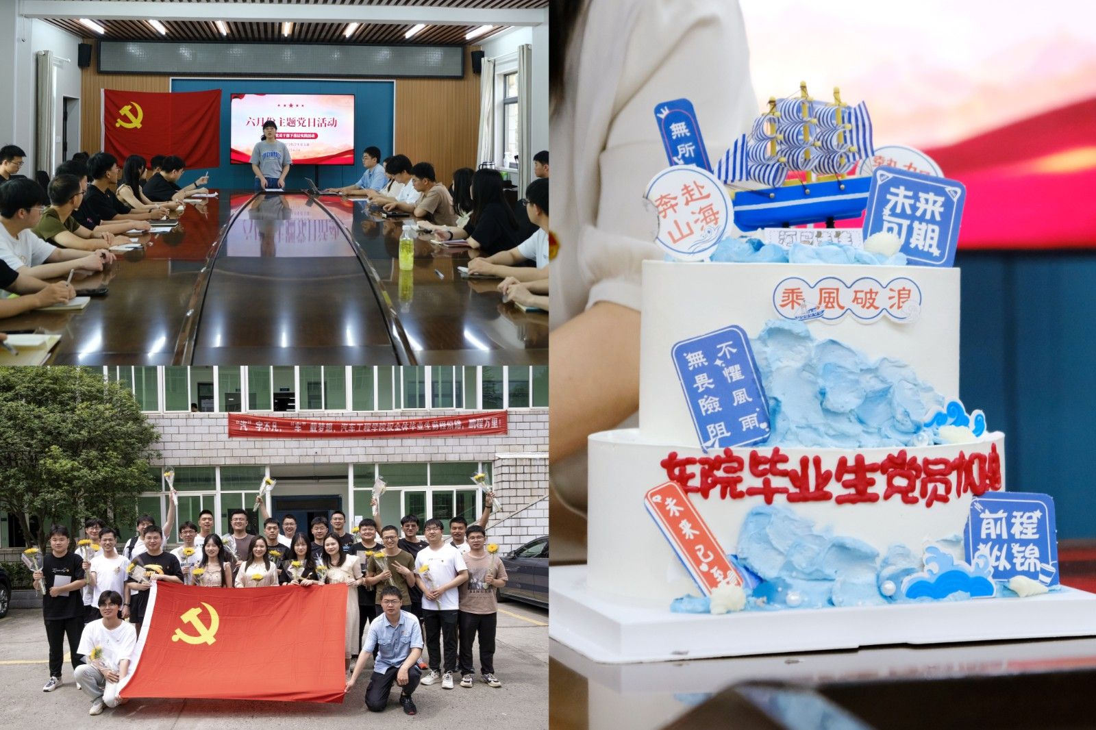 “三言两语”寄真情,毕业生党员们依次发言,有的表达对学校、老师的真诚感谢,有的分享大学期间难忘经历,还有传授参加竞赛和提高学习成效的经验……预备党员陆致远、刘汶汶分别献上《入海》《凤凰花开的路口》两首歌,以表达对毕业生党员的祝福。在歌曲尾声,胡霄寒老师为每一名毕业生党员们送上鲜花、明信片,并切分祝福蛋糕,轻松而温馨的氛围让不少毕业生党员潸然泪下。