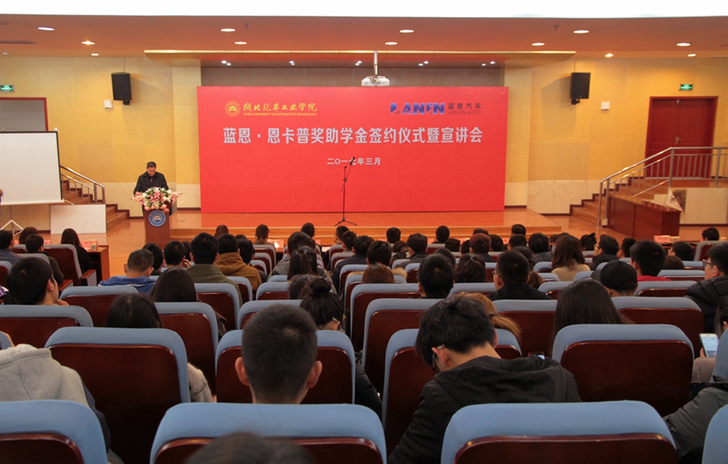 03届校友、武汉蓝恩新能源汽车产业发展股份有限公司董事长蒋武代表公司与母校在逸夫图书馆报告厅签订了奖助学金捐赠协议,为母校捐赠300万元设立“蓝恩·恩卡普奖助学金”,这也是我校自建校以来校友企业最大单笔捐赠。