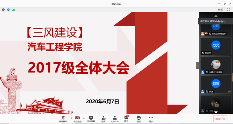 学工办于6月7日晚依托腾讯会议平台召开了2017级期末学风与考风建设大会,会议由学生年级负责人邢耀文主持,分团委书记胡霄寒和200多名同学共同参与。