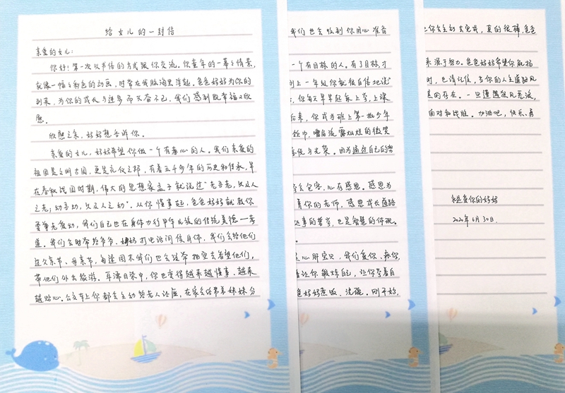 办公室主任周丹则把家书写给了自己的女儿,“第一次以书信的方式”跟她交流了成长带来的欢乐和幸福,并以中国传统文化教育女儿孝老爱亲、做一个有孝心的人,从小立志、做一个有目标的人,心存感恩、做一个懂的回报的人,并勉励女儿“快乐来源于成功、成功来源于努力”,要以持之以恒的努力扬起青春的风帆顺利远航。