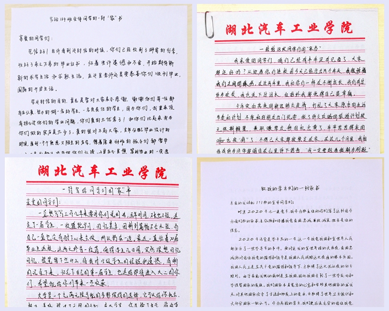 2018年入职的辅导员李雅琨给在自己所带的2018级全体学生的手写家书中回顾了自己与同学们一起成长的幸福与快乐,并以《时间之书》里的“年轻人,你的职责是平整土地,而非焦虑时光” 勉励同学们时光不等人,要做一个努力和自律的人,以今日的脚踏实地、勤奋刻苦赢得美好未来。辅导员、学工办主任朱政通过家书向同学们交流大学生活的重点、学习的重要等,引导同学们要学会规划自己的学业和未来并付诸实施,让自己的大学忙起来。博士、班主任毕崟也通过家书给所带的班级同学上了一堂思政课,要求同学们爱党爱国、诚实勇敢、主动担当。