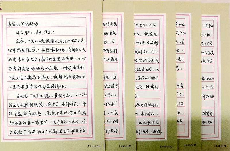 车院分团委书记胡霄寒在给自己父母的手写家书中深切回顾了她的父亲在其入职时的殷切期望:“忠于自己的事业,务必勤勉”,以及母亲给她讲诸葛亮、包拯、魏征等忠义之士的廉洁与忠诚,并谈到了自己对廉洁忠诚的思考:“它更像是一种‘舍我其谁’的担当、一种‘天下兴亡、匹夫有责’的责任感”,并承诺绝不辜负父母期待和时代期望,做一个勇敢的战士,严守底线、忠于人民、忠于自己热爱的事业。