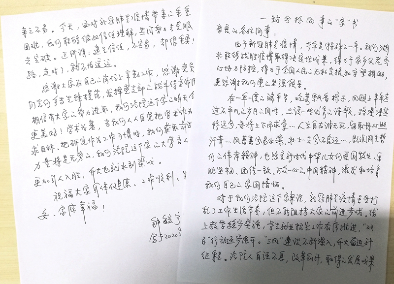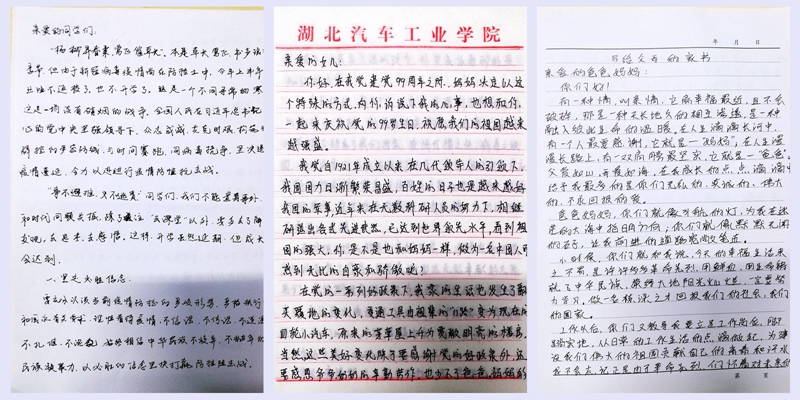 二支部书记樊继东也把家书写给了学生,告诉同学们“事不避难、义不逃责”,在疫情常态化防控形势下要坚定理想信念、保持良好心态、坚持认真自学、增进家人感情。副教授高伟在给父母的家书中深深感恩父母的培养,把父母比作自己人生的灯塔和铺路石,认为父母的教诲情深意切、受益终身,并将牢记父母教诲继续发扬工匠精神、好好教书育人。学院办公室孙永硕通过家书向女儿讲述抗疫故事,引导女儿充分理解中国共产党的领导力量与国家日益强大、人民生活日益美好等之间的关系,与女儿约定要一起学习、一起努力。