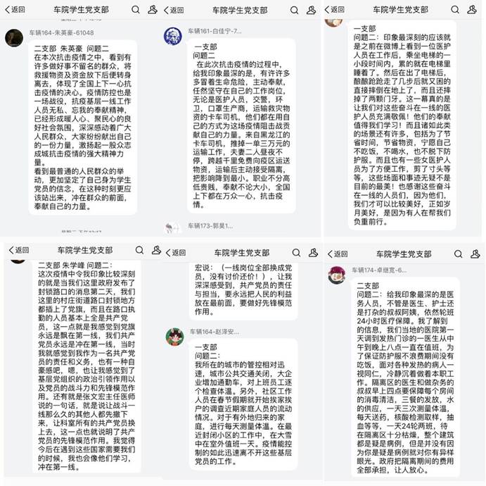 在交流讨论环节,部分党员代表分享了个人参加当地疫情防控教育宣传、志愿服务、组织捐款等工作情况,随后围绕 “在全民抗疫期间,有哪些故事和瞬间令你印象深刻,并谈谈对自己今后的影响”等问题,全体学生党员在线上踊跃发言,各抒己见。刘宇璐同志表示:看到冲在一线的各类工作者全力救治人民保护人民,我们作为一名党员要积极响应党和国家的号召,带头落实防护措施,同时呼吁提醒周围群众做好防护不要聚众,不给社会不给他人增添麻烦。郭文韬同志谈到:新型冠状肺炎疫情暴发后,医护人员承受了巨大的压力,上海市医疗救治专家组组长、复旦大学附属华山医院感染病科主任张文宏说:“一线岗位全部换成党员,没有讨价还价!”让我深深感受到共产党员的责任与担当,作为一名党员要永远把人民的利益放在最前面,要做好模范先锋作用。讨论发言环节,所有党员全部参与,人均发言文字达200字以上,以文字形式表达了自己对抗疫工作的认识和共产党员党员初心使命的理解