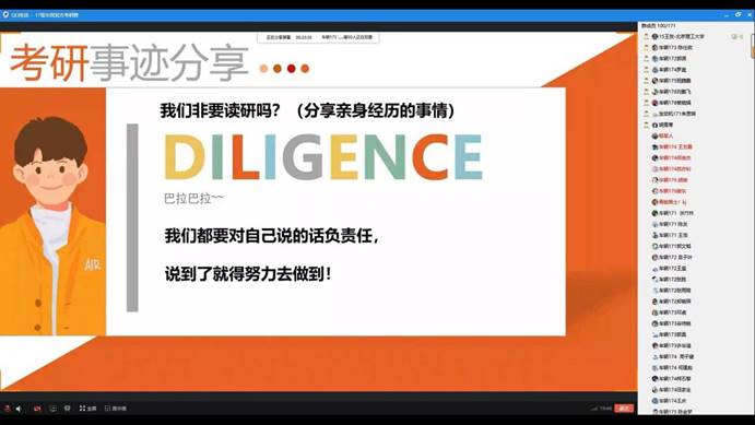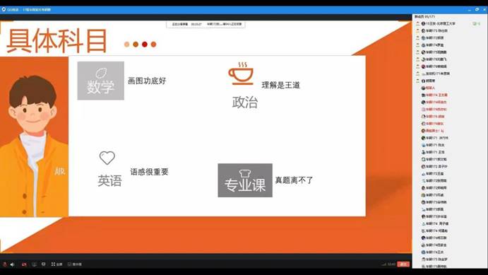 活动由学生会主席裴晓娟主持,她首先介绍了活动开展的目的、当前17级学子面临的抉择,学业职业发展压力等,强调了分享会的纪律要求并鼓励大家积极互动。随后,王贺结合自身考研前后经历,整体性提出建议大家考研必须下决心,一旦决定了就要勇往直前、绝不回头。复习过程中,平心静气、寻找盟友、客观评估是一个良好的开端,遇到复习困难要多与同学老师交流,疫情期间要充分利用现在的互联网平台开展线上复习,结合自己心仪考研学校的录考标准制定适合自己的一套循序渐进的复习计划。在具体各科目的复习经验方面,他说到英语是考研的拦路虎,提高英语水平重在平时的积累,每天抽出时间背单词、背作文都是必须坚持的,刷题也是备考最直观的提升方法。数学是工科考研的重头戏、是基础是关键,复习中除了不断的做真题,还要学会合理的利用错题集做到不在同一个问题上栽两次跟头,提高效率。政治重在理解要学会分析问题,知道出题人在问什么、自己要答什么,要做到答题有理有据。而专业课要学会把自己从书本上学习的基础知识进行提升,结合多重资料,扎扎实实巩固和提高。在互动交流环节,王贺耐心解答了每一名同学们的提问,还留下了联系方式和详细的复习笔记。他寄语备考的学子们:“考研路上不是一个人在战斗,我们都要对自己说的话负责任,说到了就得努力去做到,在遇到了困难时努力解决它,才能看出来你是不是真正的在用心前进”。