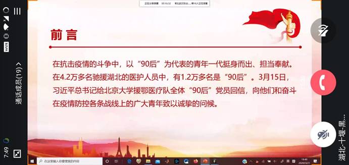 此次活动以班级支部为单位有序开展,活动分为学习一位楷模、学习回信、分享感悟、重温誓词四个环节。活动伊始,同学们通过PPT演示文稿和全国人民齐心抗疫的视频共同学习了党中央关于疫情防控的重大决策部署和习近平总书记重要指示精神,深刻领悟到新时代中国特色社会主义制度在疫情防控工作中的优越性。学习一位楷模环节,展现了中国工程院院士、国家呼吸疾病临床医学研究中心主任钟南山,拥有55年党龄不忘初心、冲锋在前、84岁再战防疫最前线的故事。学习回信环节,同学们共同朗读学习了习近平总书记回信的原文,体悟总书记对新时代青年的肯定和期望,明确新时代青年肩负的时代责任与担当。分享感悟过程中,同学们结合抗疫过程中涌现的先进典型和自身实际积极踊跃发言,表达了要心系疫情、心系祖国、为坚决打赢疫情防控阻击战贡献青春力量的坚定决心。重温誓词环节,通过重温入团、入党誓词,大家时刻牢记身为一名共青团员、党员的责任与义务。在防疫抗疫这个特殊时期,必须时刻严格要求自己,主动担当作为,贡献微薄之力,争做有理想、有本领、有担当的新时代青年。