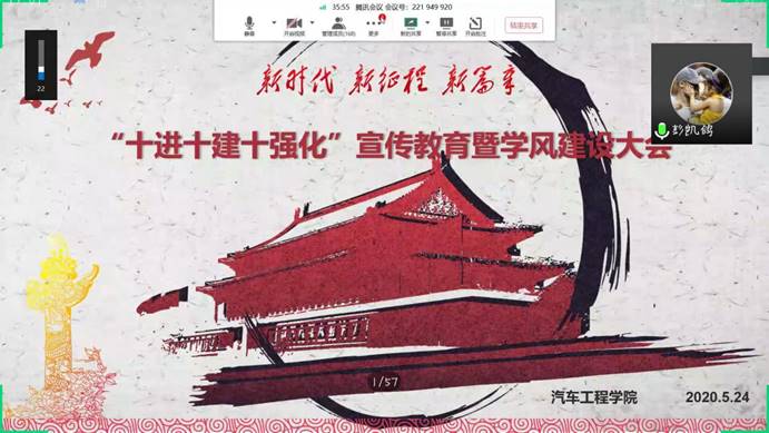 于5月24日19:00利用腾讯会议平台召开了“十进十建十强化”宣传教育暨学风建设大会。分团委书记胡霄寒、学工办主任朱政、分团委副书记王方勇以及19级两百余名同学参加了此次会议。