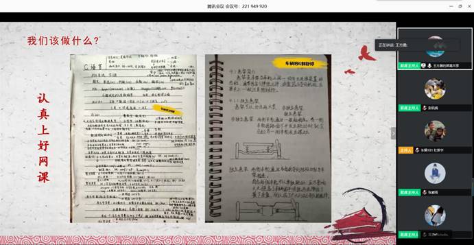 会议伊始,胡霄寒向参会同学介绍了此次会议举办的目的和意义,她强调广大团员青年作为党组织的后备军,要主动学党章、尊党规、守党纪,以更高标准要求和规范自己的言行。随后主持人通过屏幕共享带领全体同学观看学习了十进十建警示教育片视频、《中国共产党纪律处分条例》、《中华人民共和国监察法》。随后,王方勇结合PPT以5.4青年节习近平总书记对广大青年的寄语为序,号召同学们珍惜宝贵的青年时光,把学习作为当下的首要任务,并以真实案例向同学们诠释了“十进十建十强化”的含义。他还提出“我们应当担当什么样的使命”、“大学生作风建设与学风建设的关系”两个问题,和同学们展开互动交流。现场还展示了部分同学优秀笔记、打卡锻炼的照片,借此激励同学们培养良好习惯、建立优良学风。