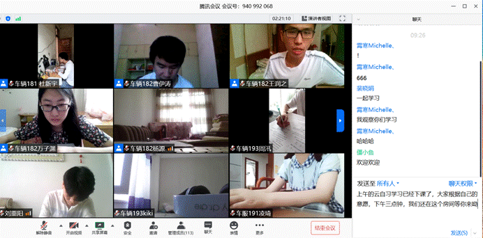 宅家自习,静待花开。分团委书记胡霄寒鼓励到,“看到云自习室内满满的人头,亲切可爱的每一个车院人,就能感受到大家认真努力的气势!期末考试近在眼前,居家复习绝对不可松懈,后期的云自习我们将邀请专业课老师加入为大家更好的指导,学院与每一名同学心连心,共同奋斗、携手前行。