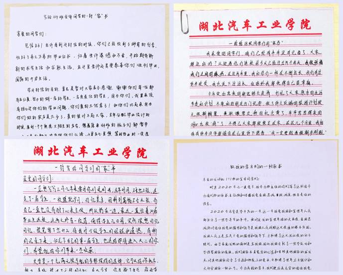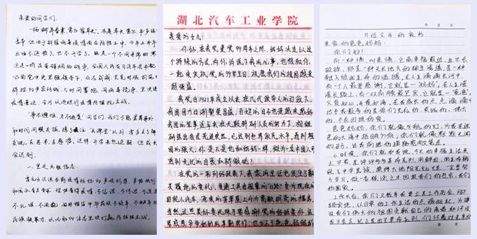 2018年入职的辅导员李雅琨给在自己所带的2018级全体学生的手写家书中回顾了自己与同学们一起成长的幸福于快乐,并以《时间之书》里的“年轻人,你的职责是平整土地,而非焦虑时光” 勉励同学们时光不等人,要做一个努力和自律的人,以今日的脚踏实地、勤奋刻苦赢得美好未来。辅导员、学工办主任朱政通过家书向同学们交流大学生活的重点、学习的重要等,引导同学们要学会规划自己的学业和未来并付诸实施,让自己的大学忙起来。博士、班主任毕崟也通过家书给所带的班级同学上了一堂思政课,要求同学们爱党爱国、诚实勇敢、主动担当。