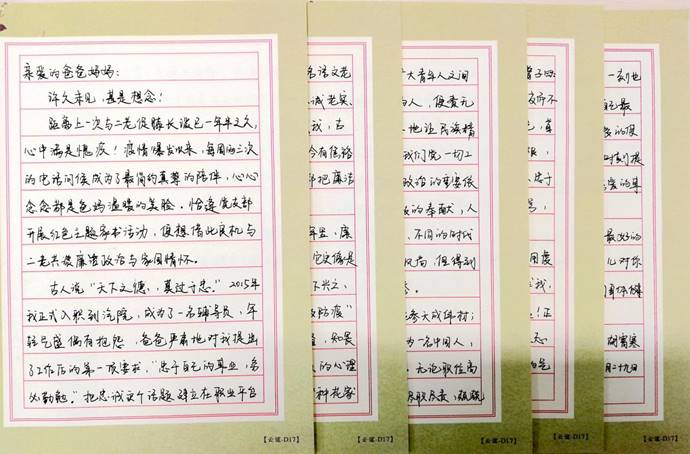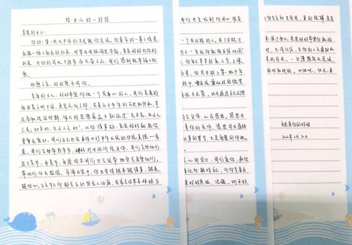 学院办公室主任周丹则把家书写给了自己的女儿,“第一次以书信的方式”跟她交流了成长带来的欢乐和幸福,并以中国传统文化教育女儿孝老爱亲、做一个有孝心的人,从小立志、做一个有目标的人,心存感恩、做一个懂的回报的人,并勉励女儿“快乐来源于成功、成功来源于努力”,要以持之以恒的努力扬起青春的风帆顺利远航。