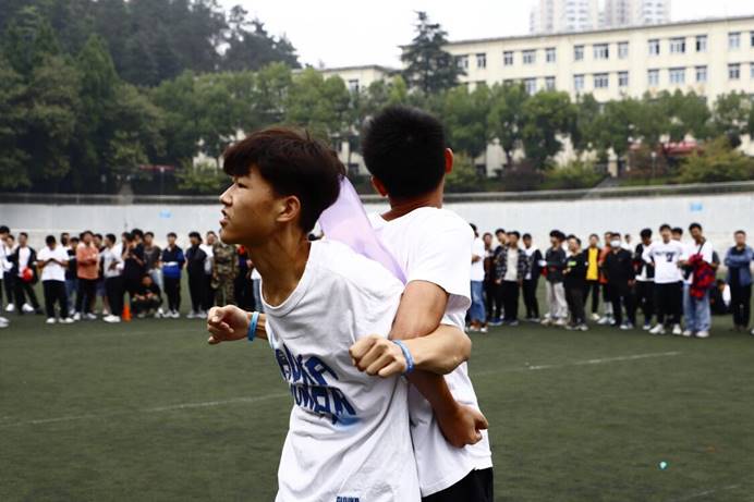此次心理团辅趣味运动会将娱乐竞赛与心理团辅相结合,以班级为单位分组进行评比,设置了“螃蟹横行”、“跃龙门”、“传情达意”等比赛项目,将趣味性和协作性融于一体。主持人向同学们讲解了活动内容和游戏规则之后,各班参赛选手们积极参与。“跃龙门”比赛中,裁判一声令下,选手们迅速坐上坐骑“神龙”开始奔跑,现场伴随着高昂的呼喊声“1、2、1”、“加油!加油!”。不同于传统运动会的庄严,心理团辅趣味运动会的欢乐感染着田径场上的每个人,比赛现场精彩纷呈,笑声阵阵。