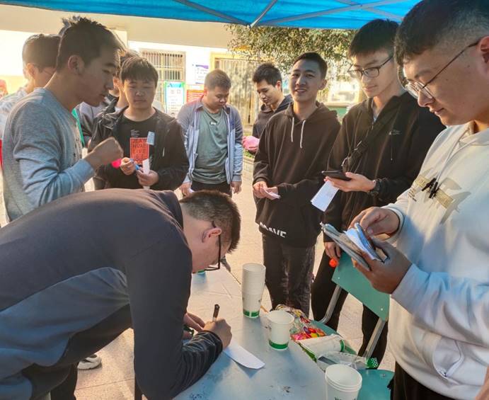 活动开始,志联组策部部长马义宇对本次活动规则进行了简要介绍,随后同学们以个人或者团队为单位,领取地图和打卡表后,自行规划最短路线,前往参与“气球递杯”“三人两绳”“你画我猜”“悬绳吃饼”四款游戏。最精彩的是游戏“你画我猜”,每组参赛人员从六套题目中抽取一套进行游戏,表演的同学只能肢体笔画或者口头提示字数,在规定时间内完成题目,实行加分制计分。初期,同学们看到纸板上代表志愿者服务相关的词汇,直呼“太难完成”“不可能”。但是在一轮又一轮不断地尝试中逐渐发现游戏技巧,在彼此默契的配合下,准确率不断提高,场上响起一阵阵欢呼声,现场气氛达到了高潮。历时三小时,所有参与人员带着集齐奉献、友爱、互助、进步的四枚印章返回桃园集合,经过工作人员的计分统计,产生一等奖1名、二等奖2名、三等奖3名。