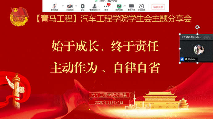 分团委利用腾讯会议平台开展了学院第四期青马工程学生会干部主题分享会。分团委书记胡霄寒主讲,第三十届全体学生会干部参加。