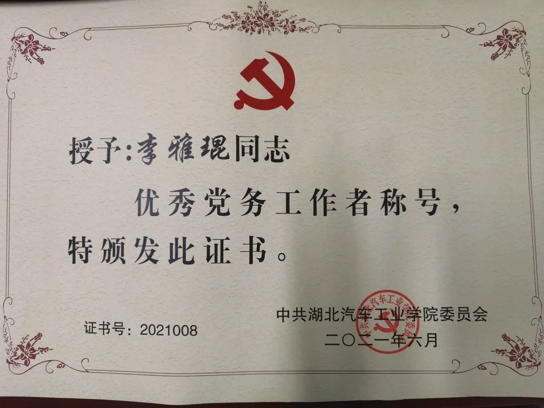 在学生党建工作方面,李雅琨坚持把创建党建品牌作为支部工作的重要抓手,不断创新和丰富党建工作形式。由学生党支部和学院学生会联合筹办的党性教育主题教育晚会,以其 “融情入景”典型案例的表现方式,获湖北省高校党支部案例创建二等奖;组织开展的“手抄党章•心握信仰”主题学习活动,入选校纪委“十进十建十强化”典型案例;组织开展了“党员助学”活动,采取党员一对一帮扶模式,效果显著;策划录制《百年党史百生讲述》短视频,由百名学生党员讲述红色故事,传承红色基因,收到良好效果。