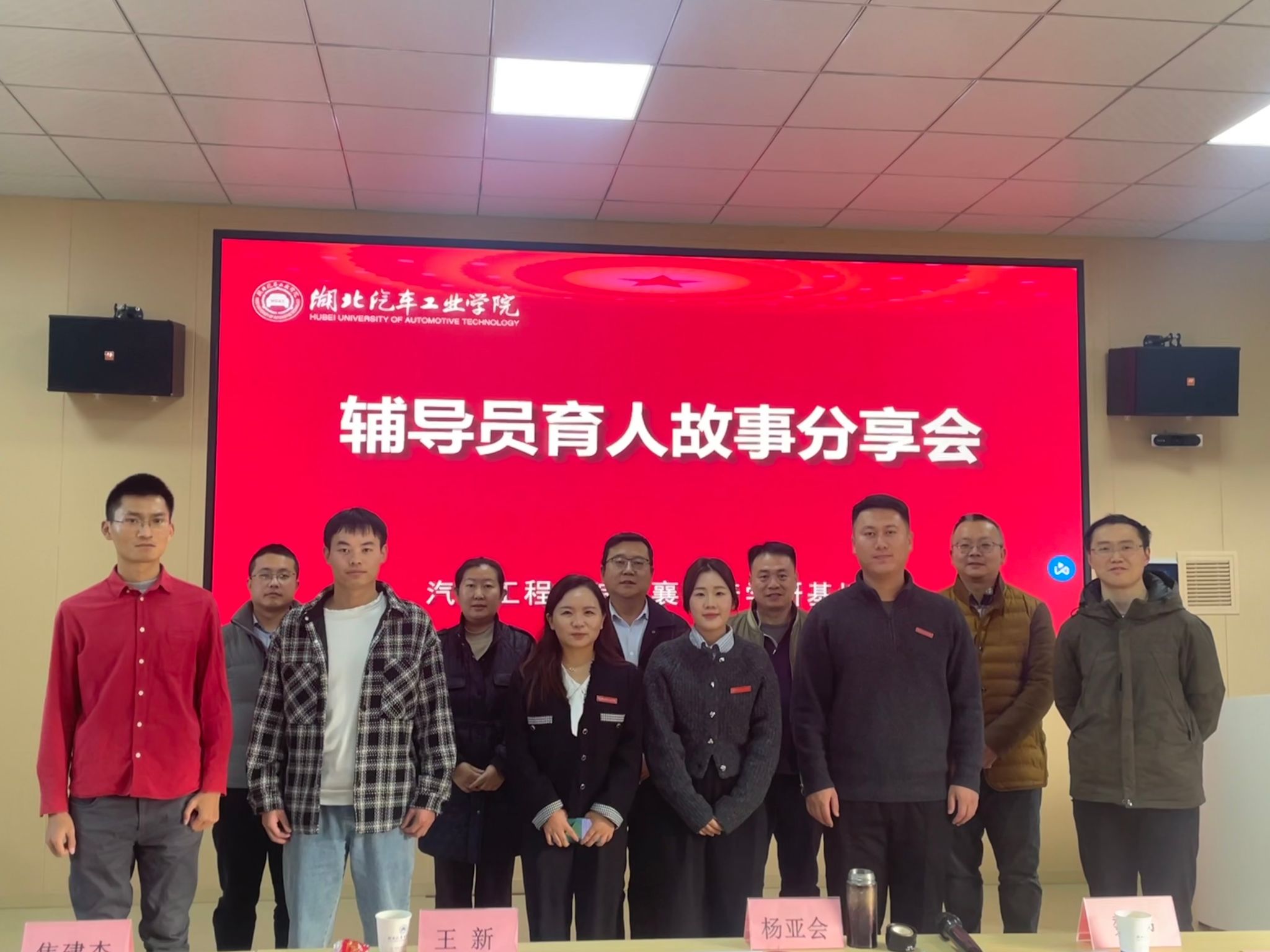 与襄阳产学研基地在汽车大院职工之家联合举办辅导员育人故事分享会。学院分党委书记杨亚会、校团委副书记焦建杰、艺术与设计学院分党委副书记王新、外国语学院分党委副书记魏伟、学工部学生教育管理科科长周炼担任评委以及5位参赛辅导员参加此次活动。校团委实践与社团工作部副主任李旭担任主持。