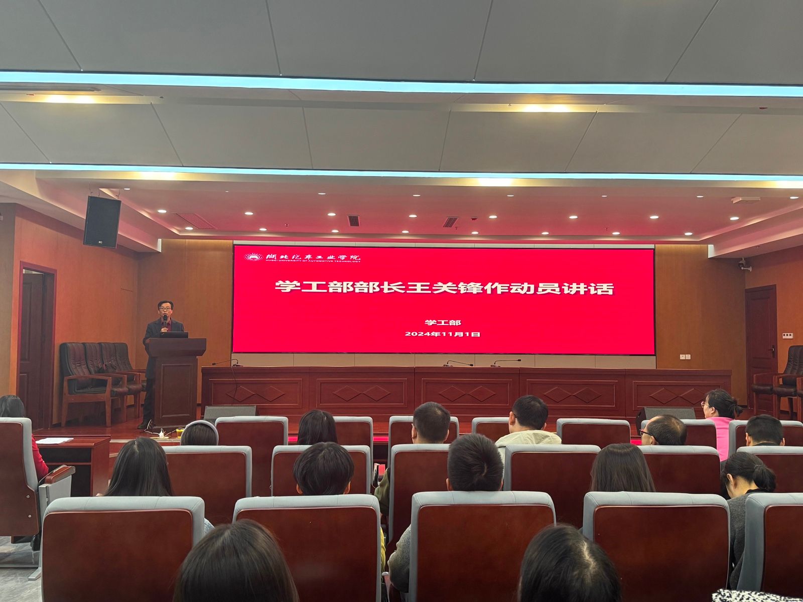 辅导员队伍建设的重要意义,紧紧抓住辅导员素质能力大赛机遇,积极备赛,以赛促成长,进一步加强自身能力素质建设。他强调,在备赛过程中,大家要明确比赛的目标和要求,认真学习比赛规则,精心准备比赛内容,制定合理的备赛计划,保持积极心态,在比赛中展现良好的精神风貌。学工部将全力为大家提供支持和保障。