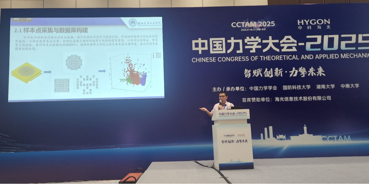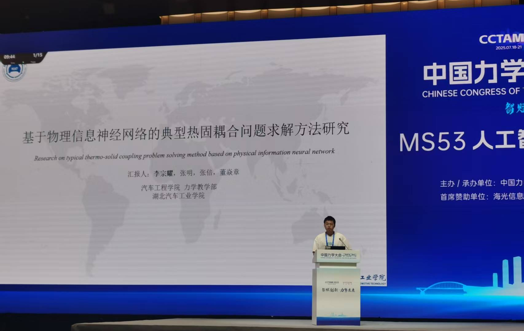 华体会体育师生积极参加了大会开幕式、主会场特邀报告、各专题分会场报告及墙报交流等活动,认真聆听了专家学者的前沿报告,深入了解国内力学研究的最新动态、发展趋势和热点方向。会议期间,华体会体育董焱章教授在复合材料及结构力学分会场作了题为《面向超材料微带天线拓扑结构的深度卷积神经网络性能预测》的学术报告,展示了车载超材料微带天线性能预测方面所取得的研究成果,引发了与会同行的广泛关注和热烈讨论。同时,华体会体育研究生李宗耀在人工智能在力学中的应用分会场作了题为《基于物理信息神经网络的典型热固耦合问题求解方法研究》的学术报告,展示了华体会体育人工智能在力学问题求解应用的研究成果,通过与众多学者的交流和学习,锻炼了研究生的学术表达与交流能力,对提升研究生培养质量具有积极意义。