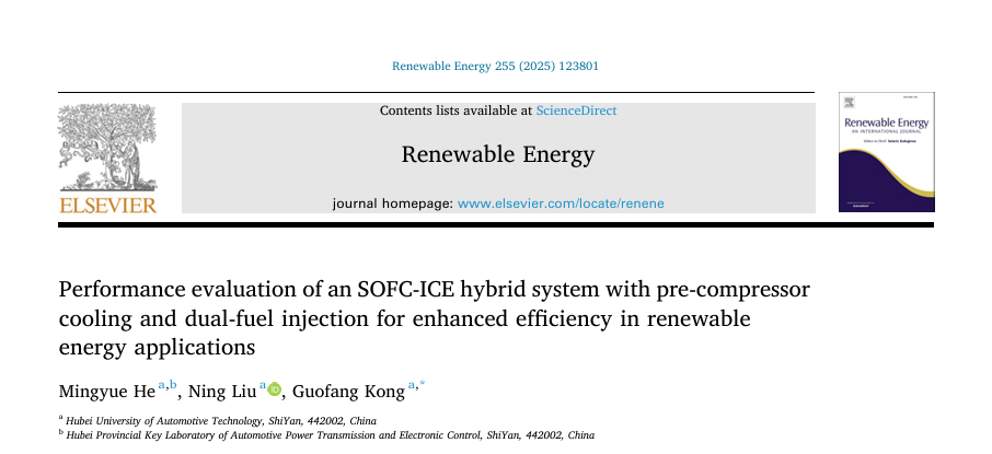在绿色可持续发展技术研究中取得新进展。2024专业型硕士研究生刘宁,在湖北省汽车动力传动与电子控制重点实验室赫明月博士的悉心指导下,以第一学生作者身份在国际工程技术领域顶级期刊《RENEWABLE ENERGY》(中科院一区TOP期刊,影响因子IF=9.0)发表研究论文,题目为“Performance evaluation of an SOFC-ICE hybrid system with pre-compressor cooling and dual-fuel injection for enhanced efficiency in renewable energy applications”。