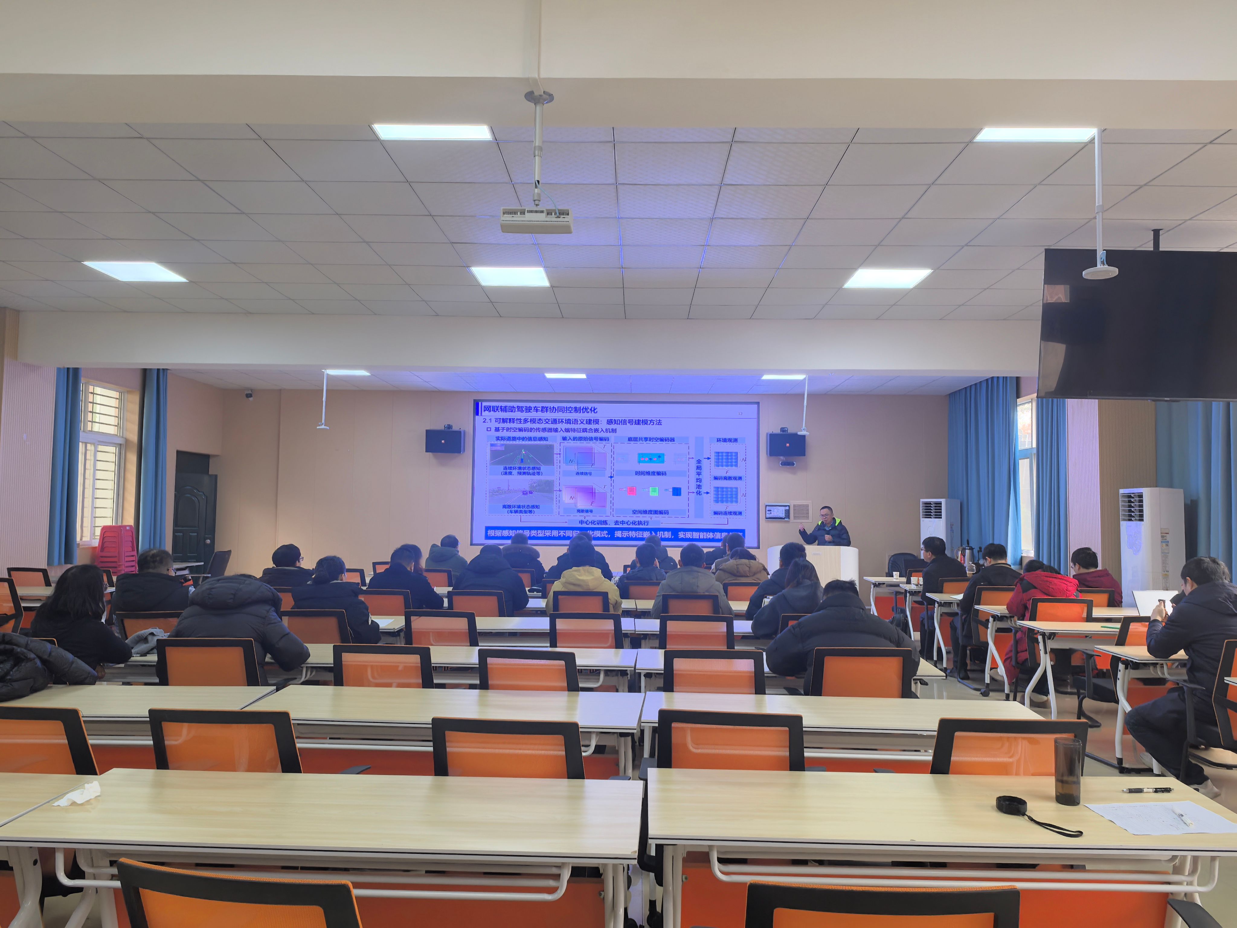 陈峥教授围绕网联辅助驾驶环境下车辆群体的协同决策与控制优化展开深入讲解,结合其研究团队在智能网联汽车、新能源汽车控制等领域的长期积累,分享了前沿理论方法与实践应用成果。他的报告内容丰富、视角新颖,为在场师生带来了重要启发。交流环节中,师生围绕算法实时性、系统安全边界等技术难题踊跃提问,陈教授结合科研实践予以细致解答,现场互动热烈。