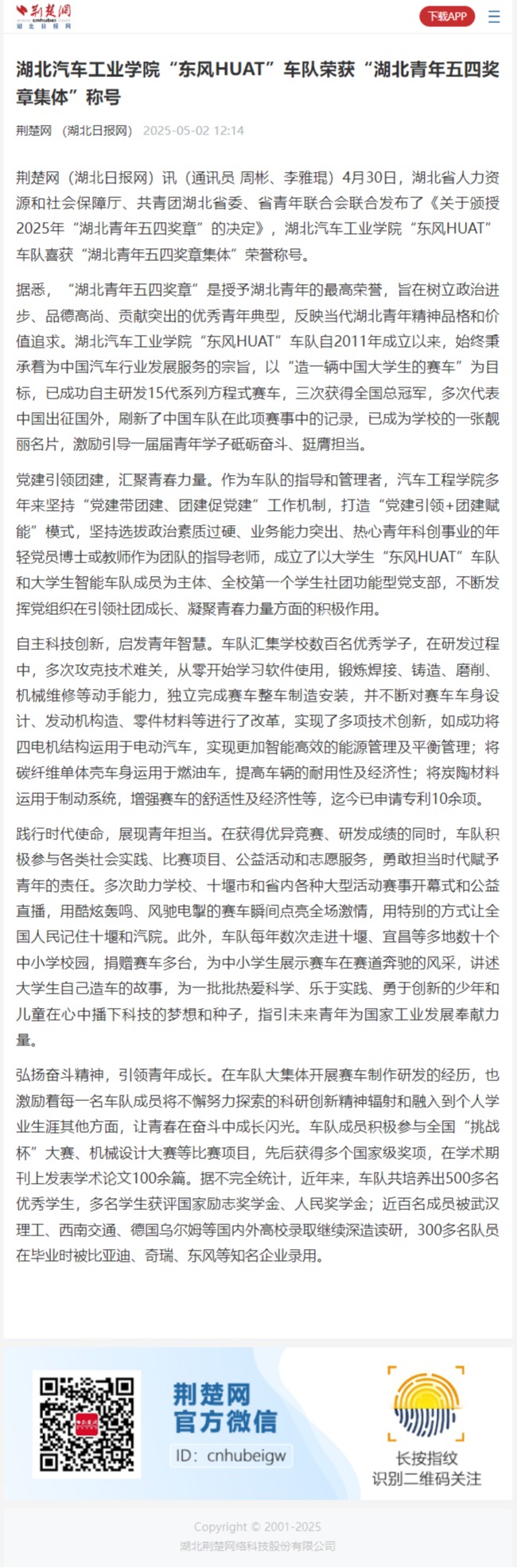 【荆楚网】华体会体育 “东风HUAT”车队荣获“湖北青年五四奖章集体”称号