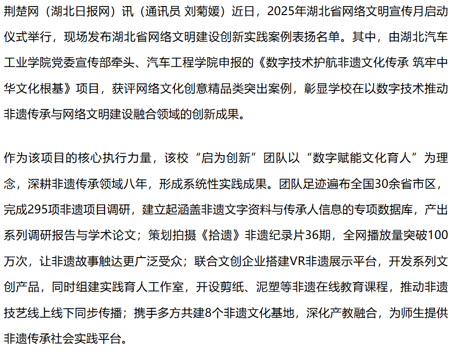 【荆楚网】数字护航非遗!华体会体育 项目入选省级网络文明建设创新案例