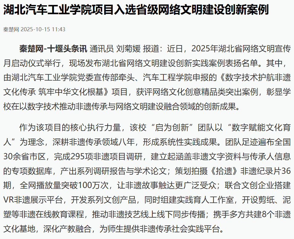 【荆楚网】数字护航非遗!华体会体育 项目入选省级网络文明建设创新案例