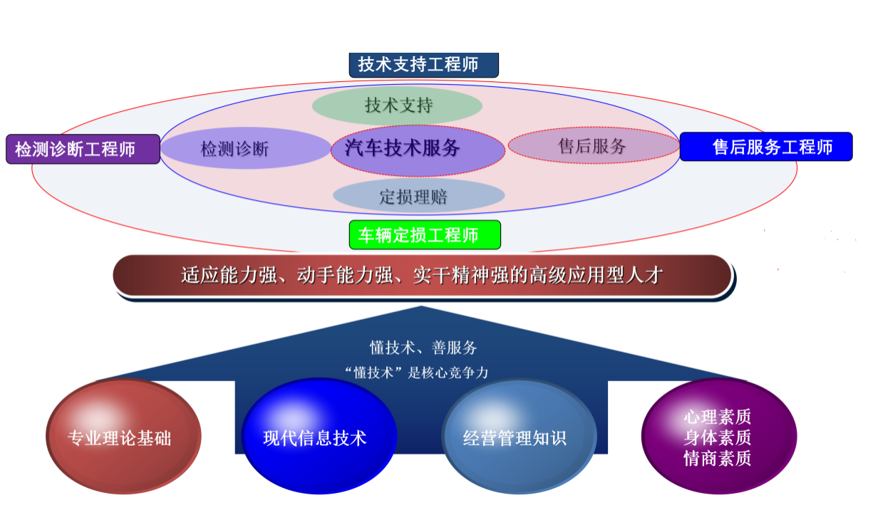 专业培养坚持“1中心,4基础,2能力,4特征”的培养特色。以培养汽车技术服务领域人才为中心,培养学生专业理论基础、现代信息技术、经营管理知识、心理素质、身体素质和情商素质为基础,使学生具备“懂技术、善服务”综合素质和能力,能胜任汽车技术支持,检测诊断、定损理赔、售后服务等领域的工作。