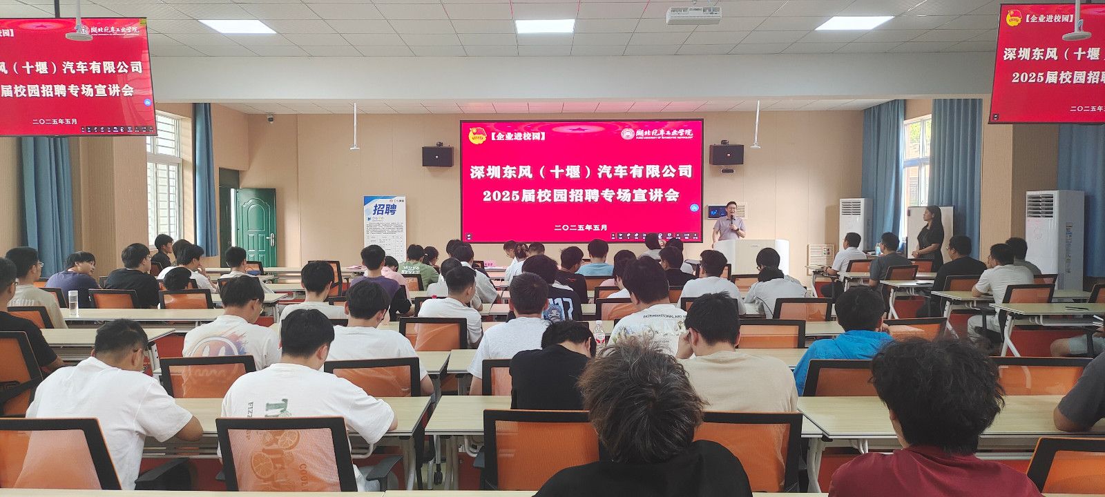 宣讲会上,十堰市倍力汽车管业有限公司董事长胡庆方和深圳东风(十堰)汽车有限公司副总经理刘银平分别进行招聘宣讲。他们详细介绍了企业的基本情况,包括发展历程、核心业务、市场地位以及未来的发展战略规划等,让同学们对企业有了一个全面而深入的了解。