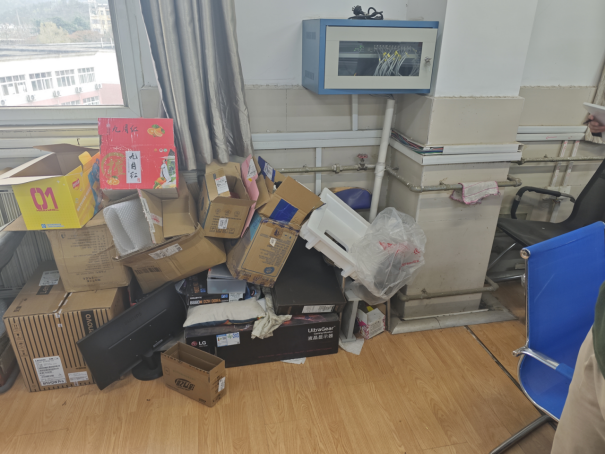 设备占道现象:闲置实验设备随意堆放,导致室内通行空间不足。