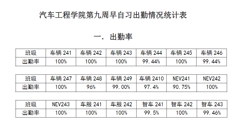 【督学正风】华体会体育 2024-2025学年第一学期第九周早自习出勤情况